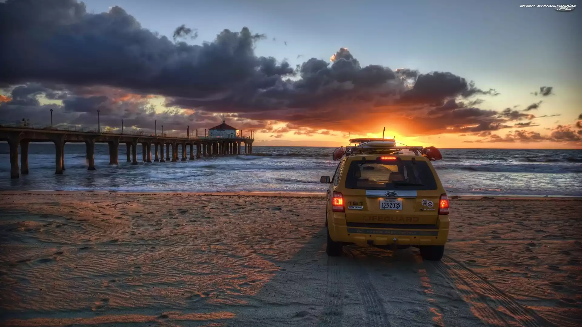 Samochód: Chmury, Zachód słońca, Plaża, Ford Escape Hybrid, Molo